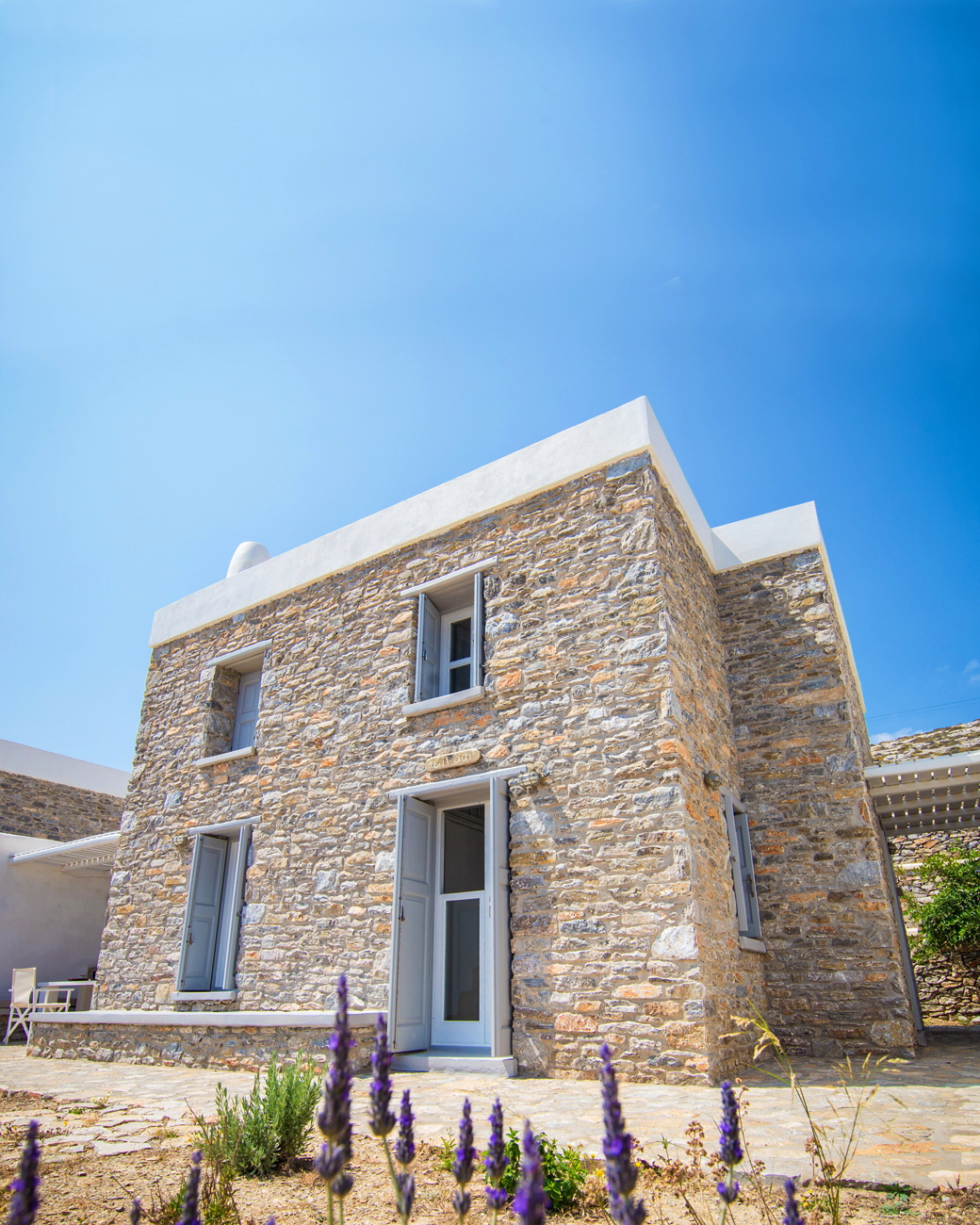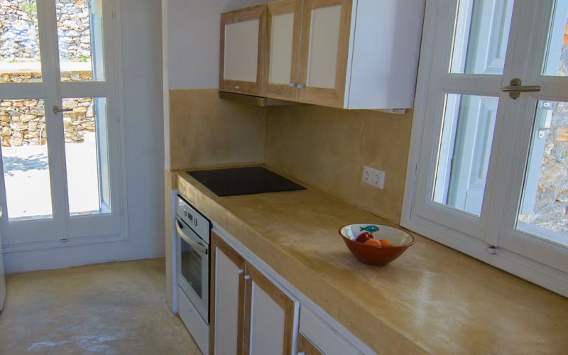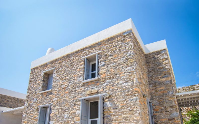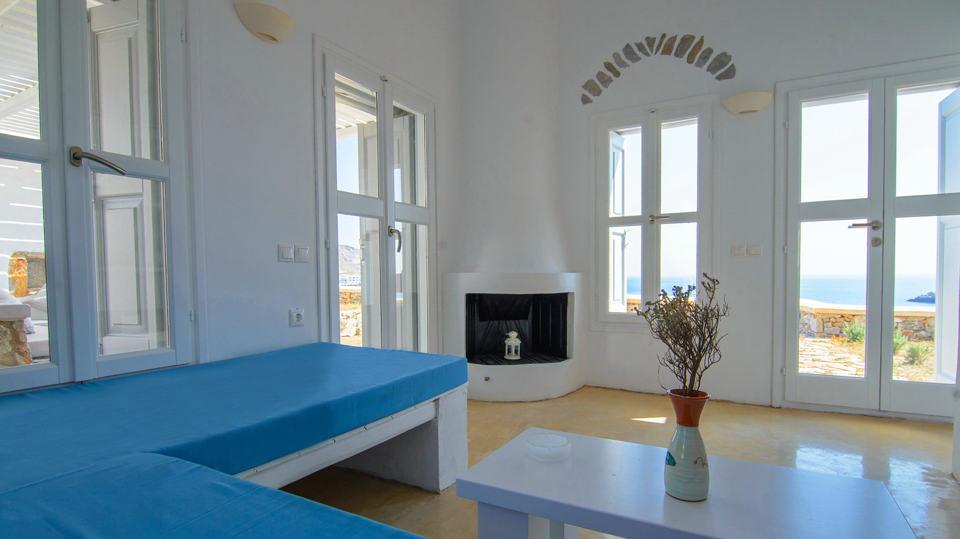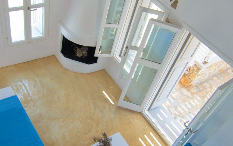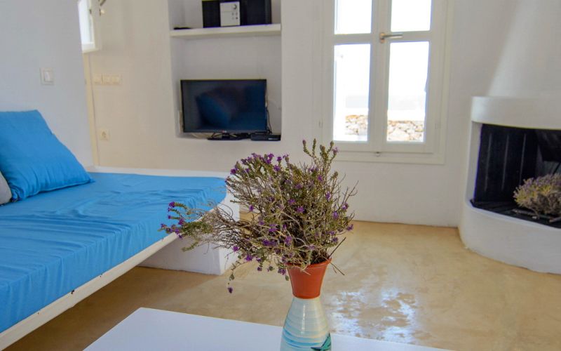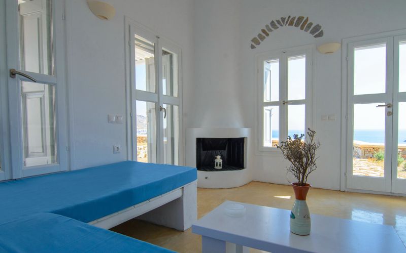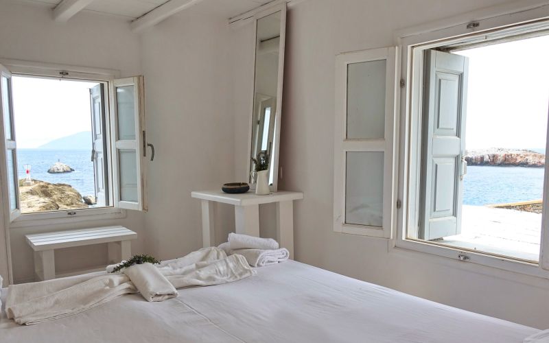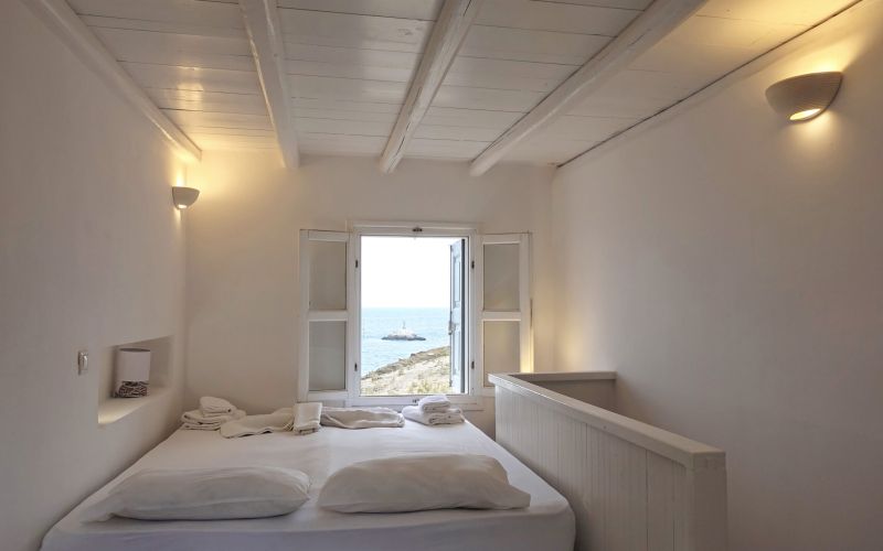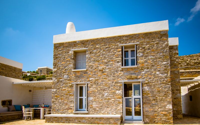 With direct access to the beach and pool, plus year-round comfort through geothermal cooling and air conditioning, it offers a serene and authentic Cycladic escape.